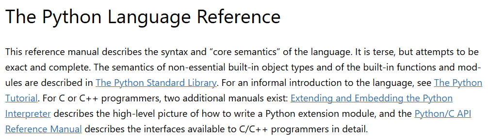 《The Python Language Reference》是Python官方提供的一份核心文档,它系统地阐述了Python语言本身的语法和核心语义。当你对某个语言机制的底层原理感到困惑时(例如,描述符如何工作、生成器的执行流程、元类的实例化过程),这份文档是最终的答案来源。它也是Python解释器实现者必须遵循的准则。
