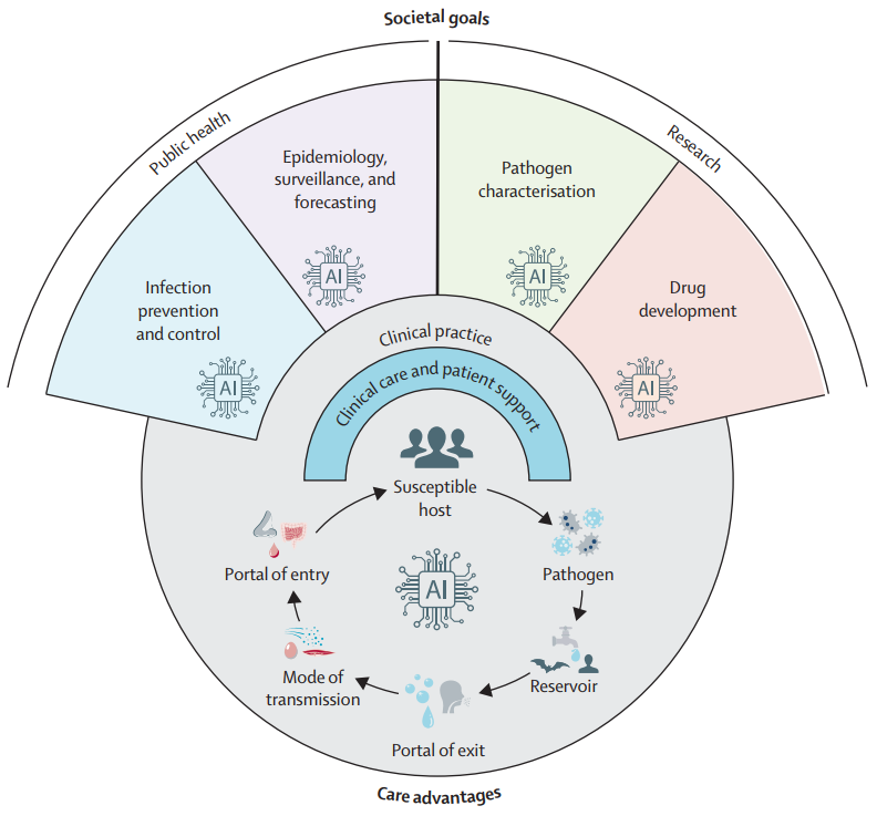 人工智能(AI)正以前所未有的深度和广度,重塑我们对抗传染病的战役。它已经深入到疾病预防、诊断、治疗和研究的各个角落,成为推动全球健康安全的关键力量。早在20世纪70年代,MYCIN专家系统就已尝试利用AI辅助抗生素治疗方案的制定,这标志着一个新时代的开端。如今,AI通过实时处理来自病原体、人类宿主和环境的海量数据,为我们应对新发传染病、气候变化和抗生素耐药性(AMR)等严峻挑战提供了前所未有的机遇。为此,Lancet Infectious Diseases 设立了“Artificial Intelligence and Infectious Diseases”专栏,讨论AI在感染性疾病中的角色定位和作用。