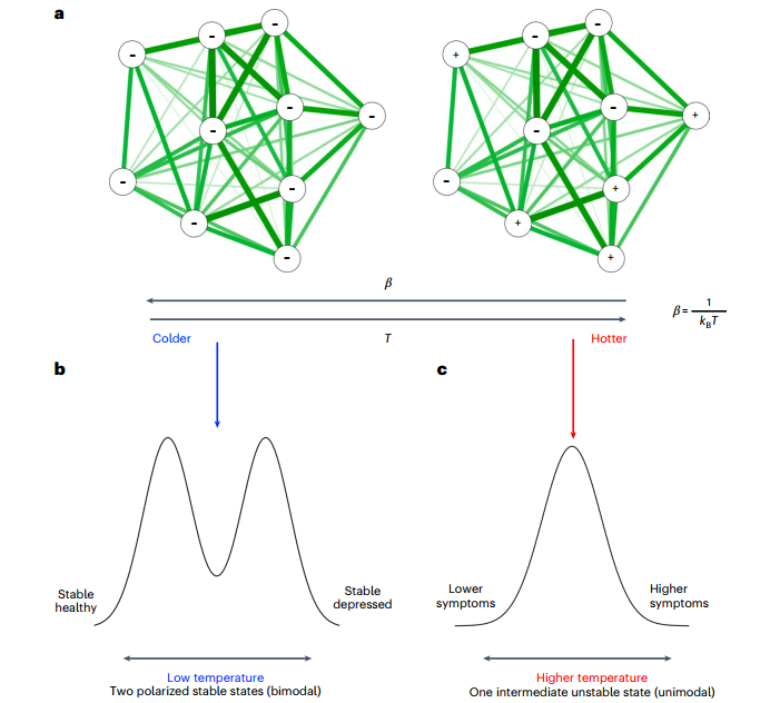 网络温度类似于统计力学中描述固体->液体->气体能态转变的物理温度,可通过伊辛(Ising)模型建模。在伊辛模型里,温度代表节点可能状态的随机性水平,放到抑郁网络中,这种随机性就是症状波动。我们还可以用熵值来衡量系统的紊乱或不确定性:抑郁网络中高熵意味着症状变化范围广、更难预测,低熵则表示症状更一致、可预测。而温度会影响全局熵,当把网络看作相互依赖的能量系统时,低网络温度会让抑郁网络呈现低熵、稳定且可预测的症状模式;高网络温度则会导致更随机的激活模式、更高的熵以及更不稳定的症状特征。