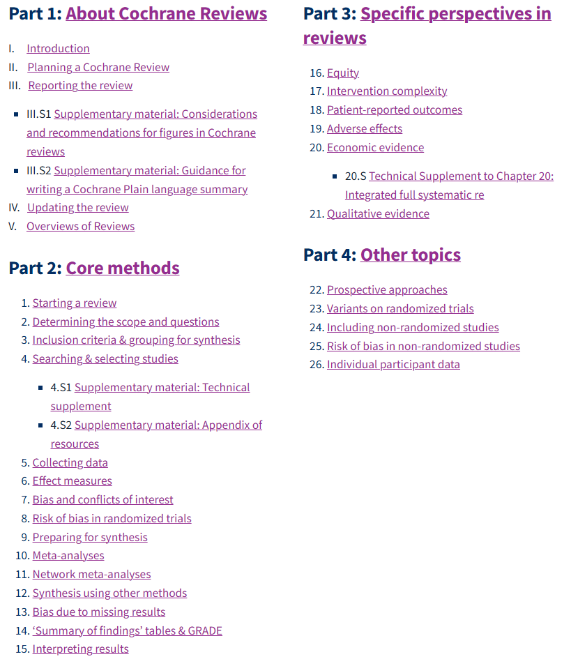 Cochrane系统评价是国际公认的循证卫生保健最高标准证据,其在线图书馆提供了各个版本的Cochrane review实施指导手册。