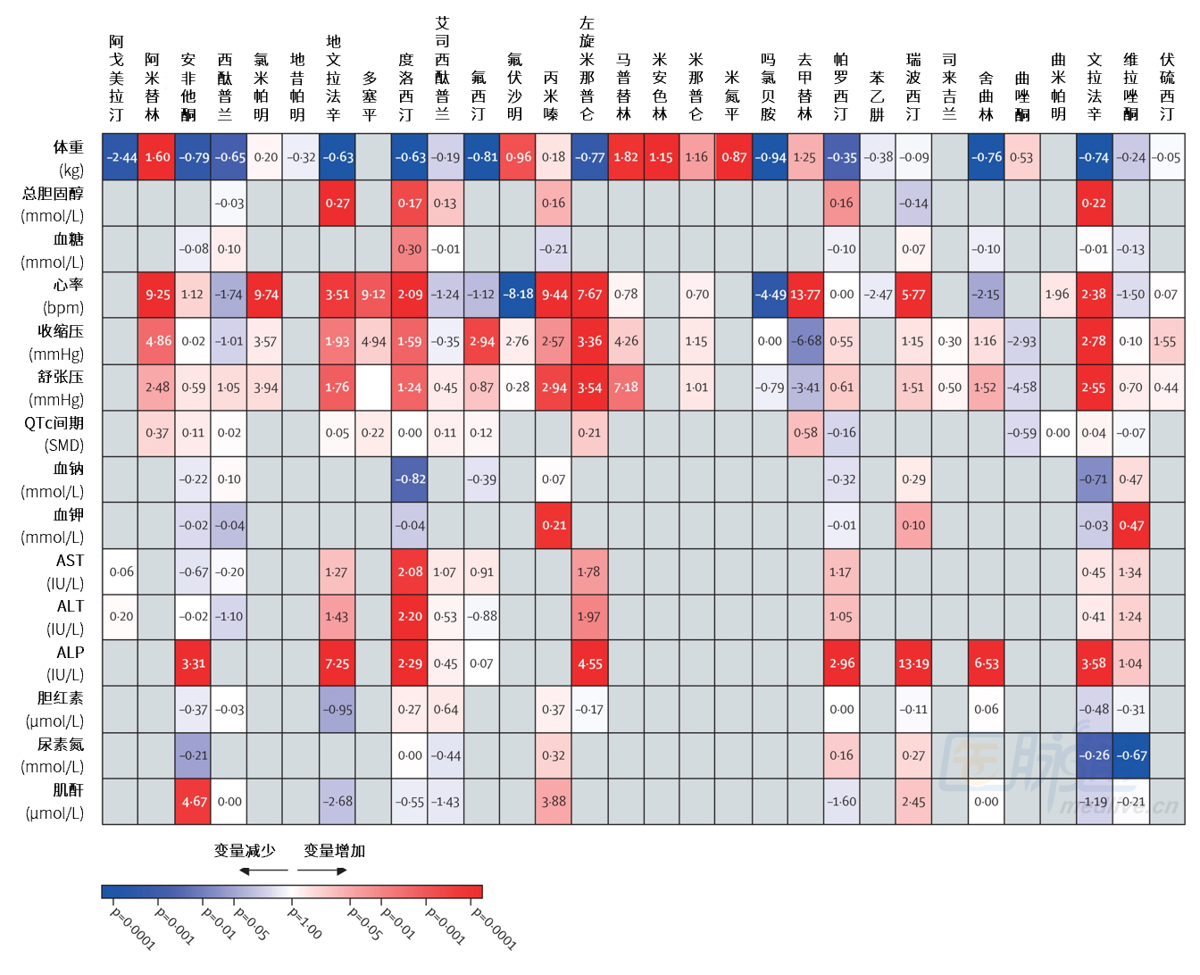 一项 10 月 21 日在线发表于《柳叶刀》的系统综述和网状 meta 分析中,研究者系统检索了 MEDLINE、EMBASE、PsycINFO、ClinicalTrials.gov 及 FDA 网站 2025 年 4 月 21 日前收录的、比较抗抑郁药单药和安慰剂用于各种精神障碍急性期治疗的单盲或双盲随机对照试验,采用频率学派随机效应网状荟萃分析对治疗引起的 15 项生理指标的变化进行了探讨;在研究层面采用 meta 回归分析评估了这些生理变化与参与者年龄、性别、基线体重之间的关联;分析了抑郁症患者症状严重程度变化与代谢指标变化之间的相关性。