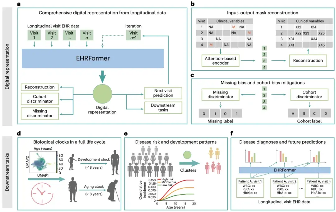 衰老是一个涉及分子、细胞和器官多层次变化的复杂过程,生物学年龄比实际年龄更能反映个体衰老速度与健康状况。随着多组学、影像学和电子健康记录的发展,衰老时钟(Aging Clock)可通过多维生物标志物精准预测个体的生物学年龄及疾病风险。该研究基于近千万人的EHR数据,利用Transformer架构的AI模型EHRFormer开发出全生命周期时钟LifeClock,首次将婴儿期到老年期的发育与衰老过程整合在同一框架中,揭示了18岁前以发育为主、18岁后以衰退为主的两种时钟模式。该模型区分了儿童和成人时钟,能准确预测不同阶段的主要疾病风险,为实现覆盖全生命周期的精准健康管理和延长健康寿命提供了新途径。
