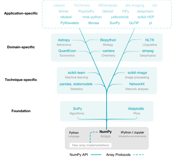 这是一篇Nature上的综述论文,罕见的对一门编程语言库进行了专门综述,足可见其重要性。这篇文章中NumPy开发者全面地回顾了Numpy的历史,介绍了NumPy的基本设计理念与用法、以及围绕NumPy建立的庞大的Python科学计算生态系统。