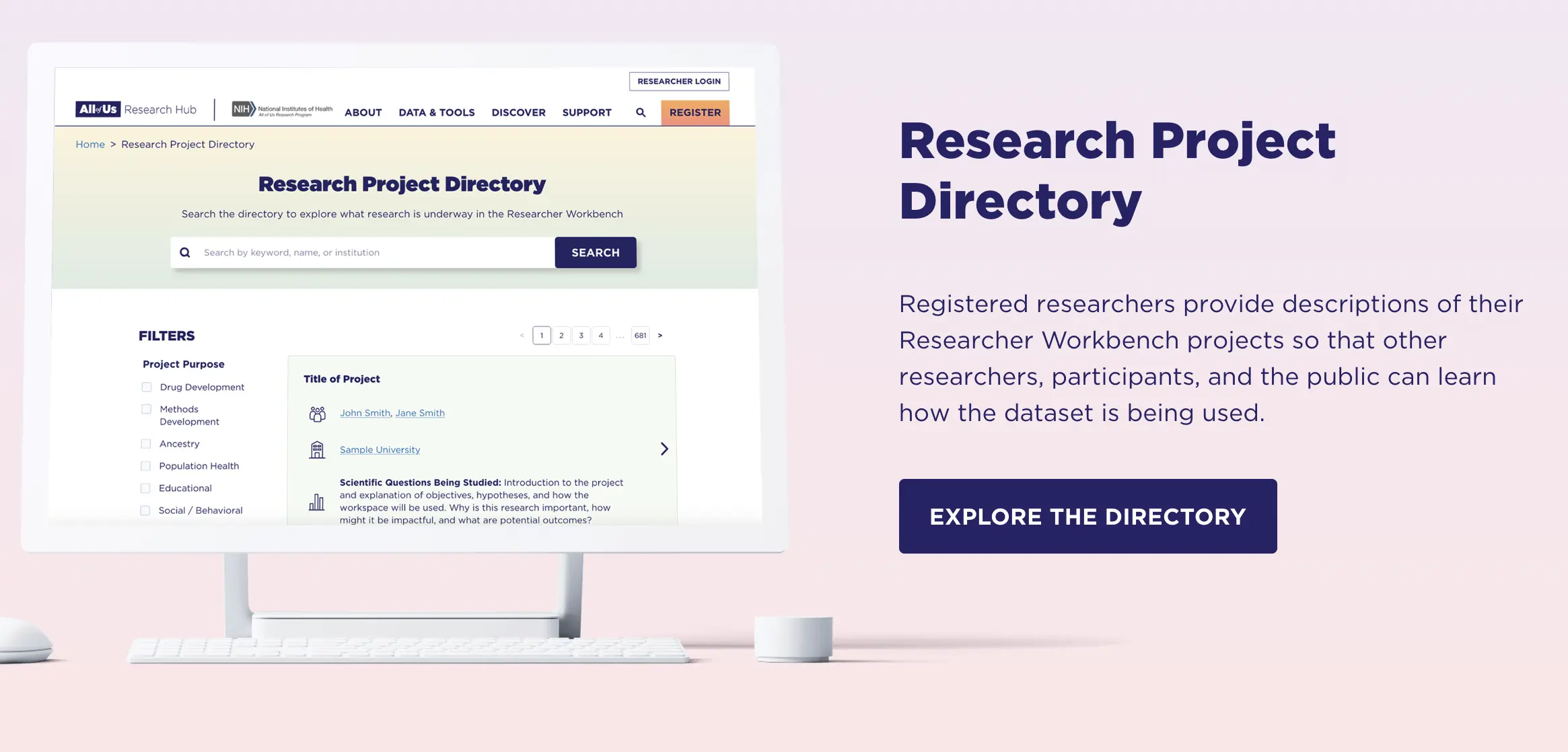 All of US 研究项目为注册研究人员提供其 Researcher Workbench 项目的描述,以便其他研究人员、参与者和公众了解数据集的使用方式。