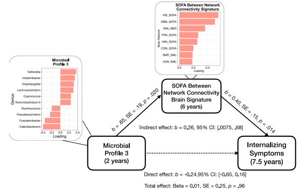 2-3岁是肠道菌群发育的”黄金期”,此时菌群会逐渐稳定成接近成人的状态;而这个阶段也是大脑发育的”敏感窗口”,神经元连接快速形成,为终身心理健康打下基础。之前的研究大多聚焦婴儿期,或只关注单一指标,而这项研究首次完整追踪了”2岁肠道菌群→6岁大脑功能→7.5岁情绪状态”的纵向关联,填补了关键空白。研究最核心的发现的是:2岁时的第三种菌群特征(含毛螺菌科等),会通过影响6岁时的大脑跨网络连接(签名2),间接导致7.5岁时的情绪问题。