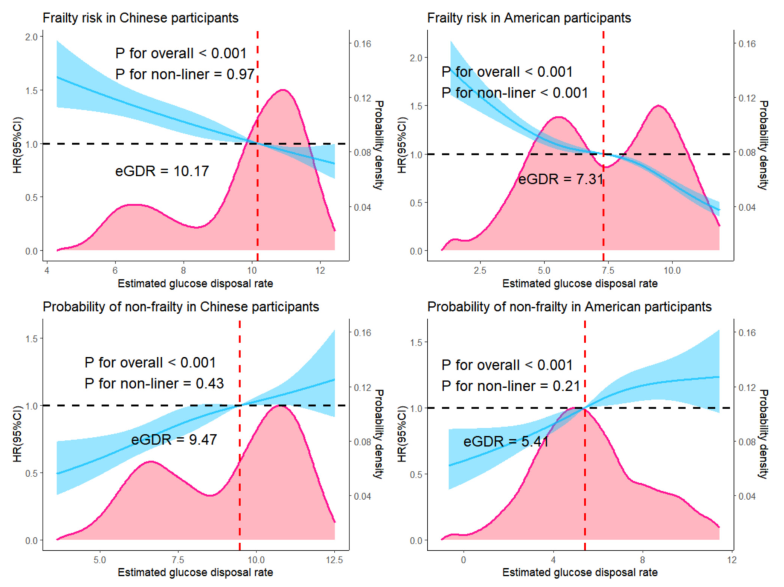 文章用多状态马尔科夫链来探索估算葡萄糖处置率(eGDR,评估胰岛素抵抗的一种指标)与衰弱风险及可逆性之间的关联,即探索eGDR对非衰弱、衰弱和死亡三种状态之间相互转移的影响。总体而言,较高 eGDR 代表更佳代谢状态,与更低的衰弱风险及更高的衰弱可逆性密切相关。GDR 作为一种简便、可临床获取的代谢指标,有潜力用于老年人虚弱风险评估和早期干预分层。