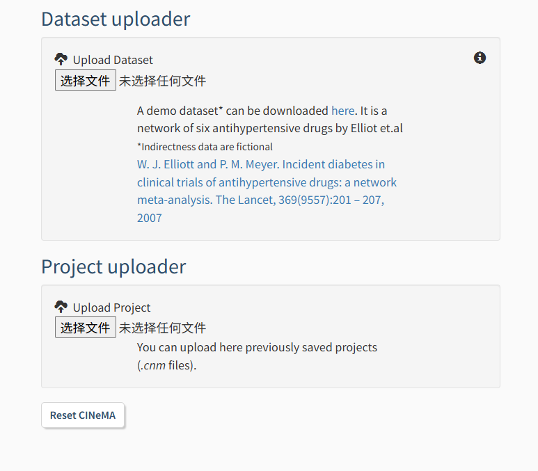 CINeMA(网状Meta分析置信度评估工具)是一款简化网状Meta分析结果置信度评估的网络应用程序。该工具基于网状Meta分析的方法学框架,考虑了影响 NMA 结果置信度水平的六个领域。CINeMA 是免费且开源的,无需登录。CINeMA 调用 R 中的 netmeta 程序来估计相对效应和异质性,随后可依次对六个领域进行系统评估。通过这种方式,评估者针对 NMA 中每个相对治疗效应在六个领域中分别评估其引发“无担忧”、“部分担忧”或“重大担忧”的程度,并在报告页面以图形方式总结所有效应估计。最终将各领域的判断汇总为单一信心评级(“高”、“中等”、“低”或“非常低”)。