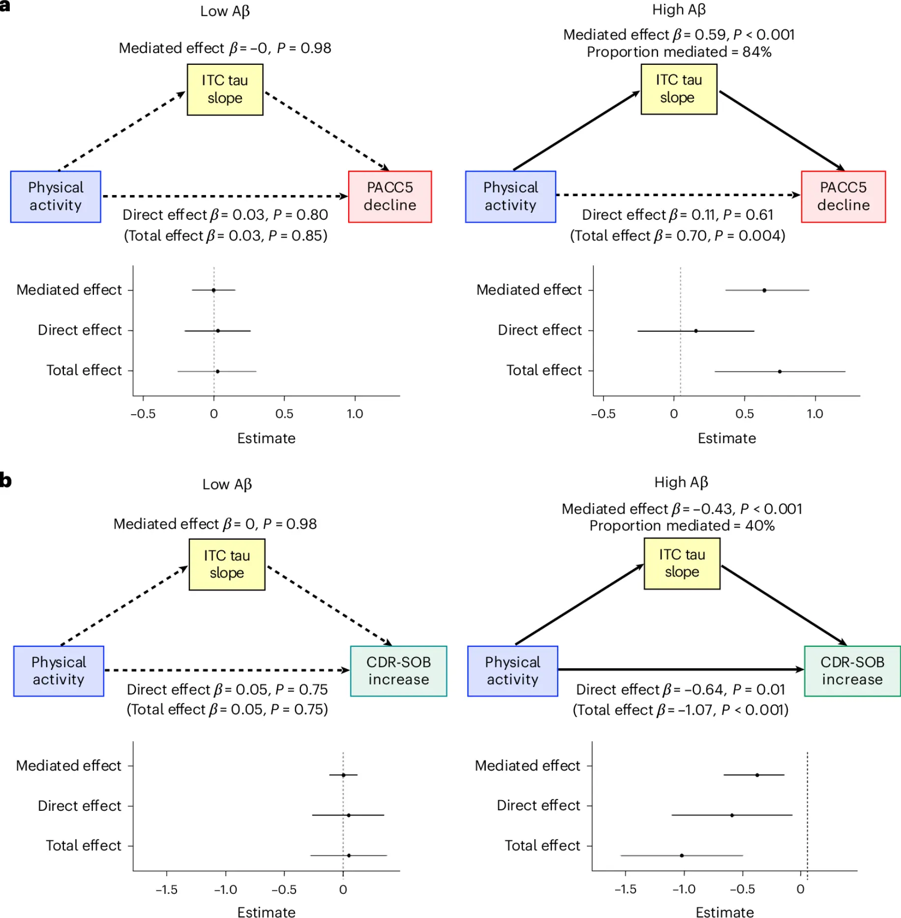 这项基于哈佛衰老大脑研究(Harvard Aging Brain Study)项目,长达 14 年的随访发现:在 β-淀粉样蛋白水平较高、阿尔茨海默病风险较高的老年人中,每天适量步行(约 3000–7500 步)能显著减缓认知能力下降。每天 3000–5000 步可延缓约 3 年,5000–7500 步可延缓约 7 年,但超过 7500 步并无额外好处。而对 β-淀粉样蛋白水平较低的人群,步行量对认知能力并无明显影响。