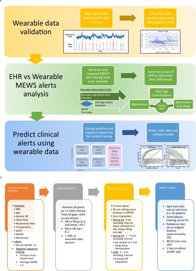 这项发表在 Nature Communications 的研究开发并验证了一种基于可穿戴设备和深度学习的院内恶化预测模型。研究利用 888 名住院患者的连续生命体征数据训练 RNN,可提前最多 17 小时预测临床警报和不良事件,AUC 高达 0.89,显著优于传统 EHR 间歇性监测。该模型为早期识别非 ICU 患者恶化提供了更及时、精准的工具,具有重要的临床和应用价值。