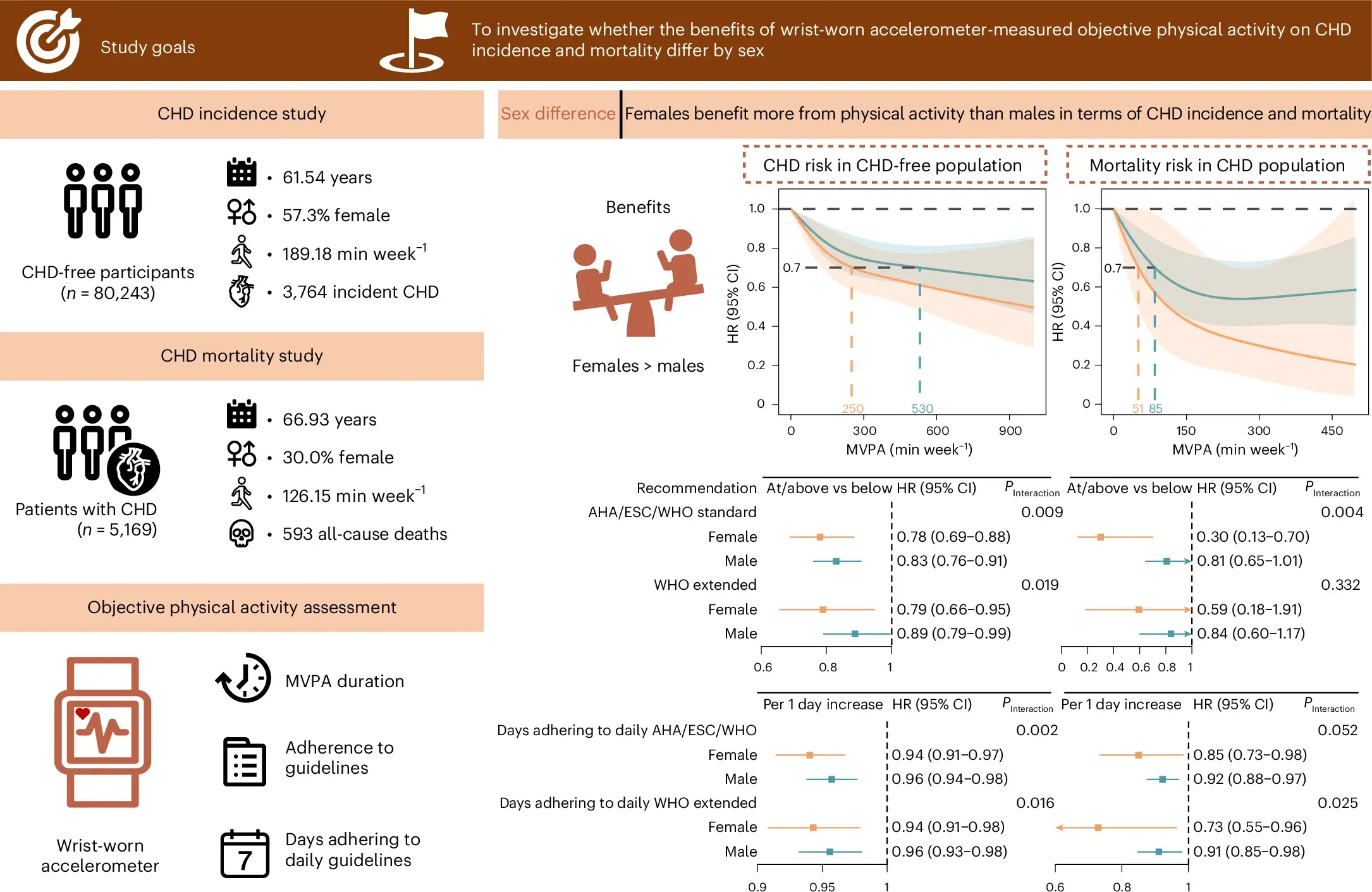 这项发表于 Nature Cardiovascular Research 的研究显示,尽管当前运动指南对男女采用相同标准,但女性实际上从运动中获得的冠心病防护作用更强。研究发现,相比男性,女性在增加身体活动后,其冠心病发病风险和全因死亡风险下降得更显著。这提示未来应根据性别差异制定更精准的运动建议,以改善冠心病的预防和管理。