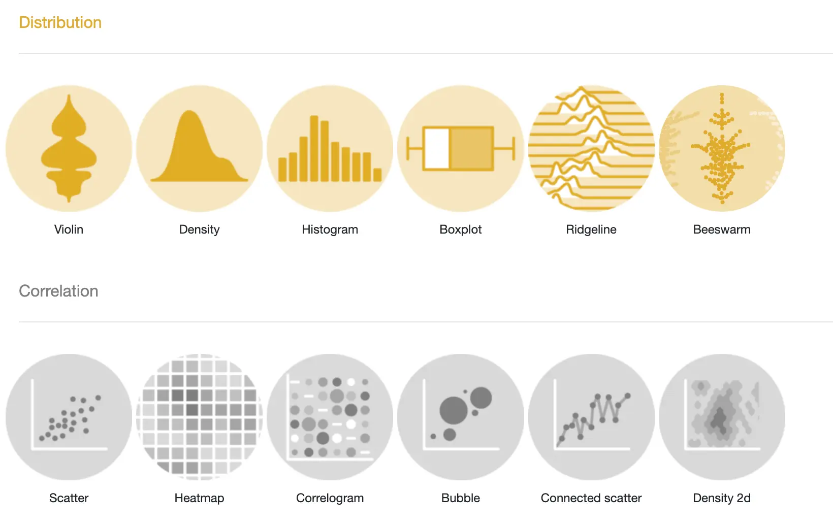 R Graph Gallery提供了最全面的 R 语言可视化示例集,涵盖 400 多个示例,按近 50 种图表类型分类,并配有可复现代码与功能说明。平台为每种图表提供基础教程和进阶自定义指南,帮助用户在掌握核心结构的基础上,灵活定制满足自身需求的高质量可视化图形。