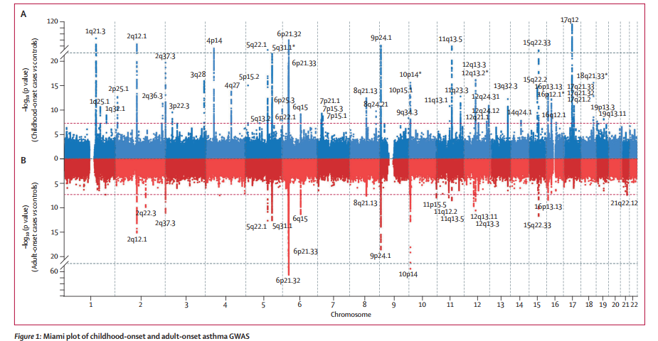这项全基因组关联研究(GWAS)发现,儿童期哮喘发病相关基因几乎是成人哮喘的3倍。成人哮喘相关的基因是儿童期哮喘相关的基因的子集,而且几乎所有这些基因对成人哮喘发病的影响都小于儿童期哮喘。研究人员还发现,儿童期发病基因在皮肤上皮细胞高表达,而不分发病时期的哮喘(即儿童期和成年期都会发生)相关基因在血液(免疫)细胞中高表达。
