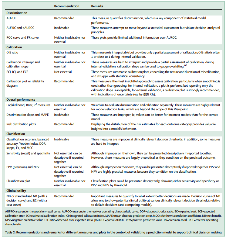 2025年12月,《Lancet Digital Health》发表了一篇总结文章“Evaluation of performance measures in predictive artificial intelligence models to support medical decisions: overview and guidance”,对评估AI预测模型性能的几大类指标进行了评估。文章讨论了五大性能维度的32种性能指标及其图形化评估方法。