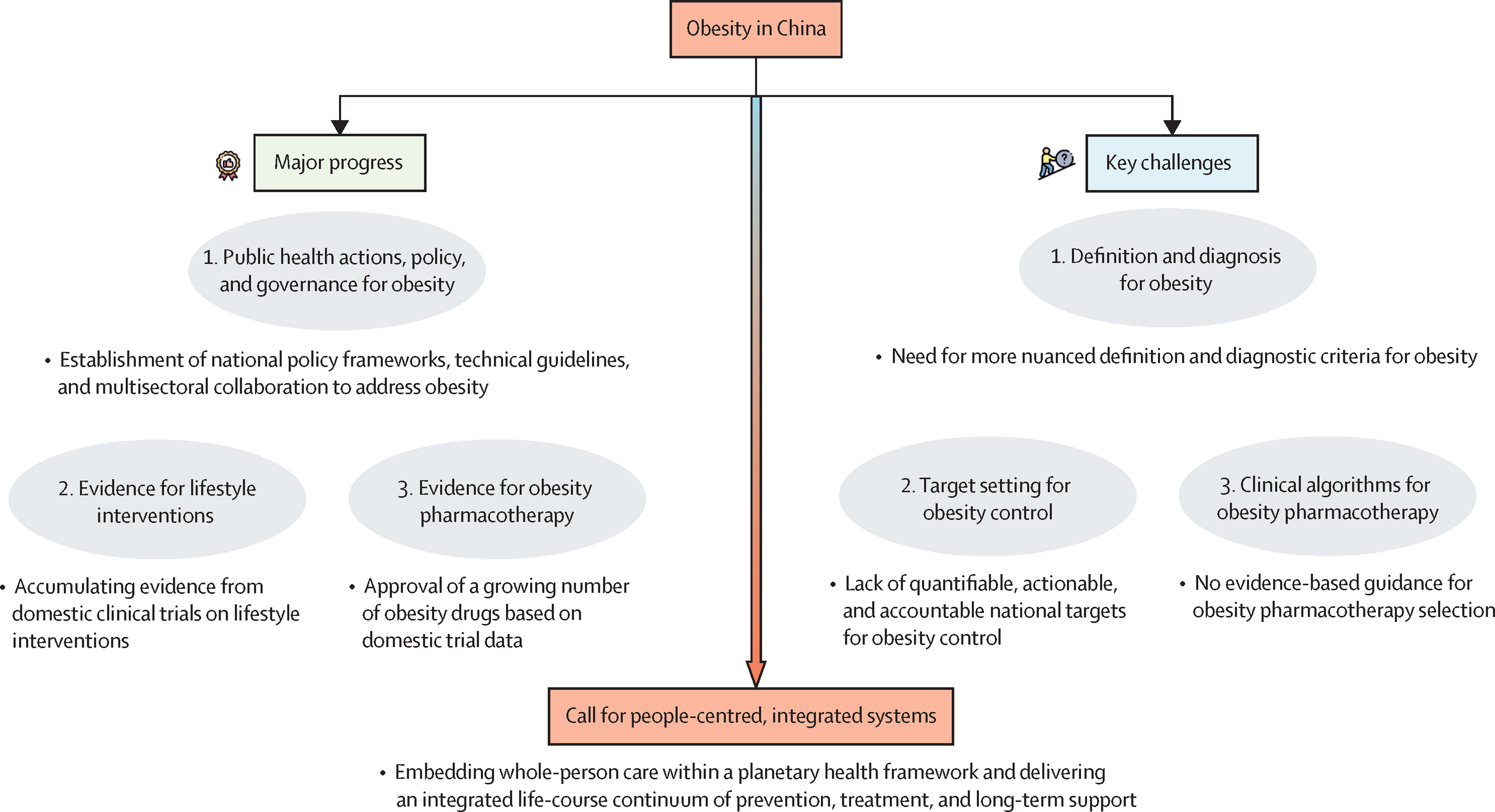 然而,仍然存在若干关键挑战,可能削弱上述进展的长期和持续影响。这些挑战包括:现有肥胖诊断标准在刻画表型差异性及心代谢异质性方面存在局限;缺乏可量化、可操作且具有问责机制的国家层面目标,从而削弱了治理与评估能力;以及缺少循证的肥胖药物治疗算法,这可能导致对药物治疗的过度依赖,并转移对社会经济、环境及行为决定因素的关注。我们呼吁建立以人为中心的整合型体系,在行星健康(planetary health)框架下,将以“全人”为导向的肥胖照护嵌入其中,提供涵盖预防、治疗与长期支持的连贯连续照护。