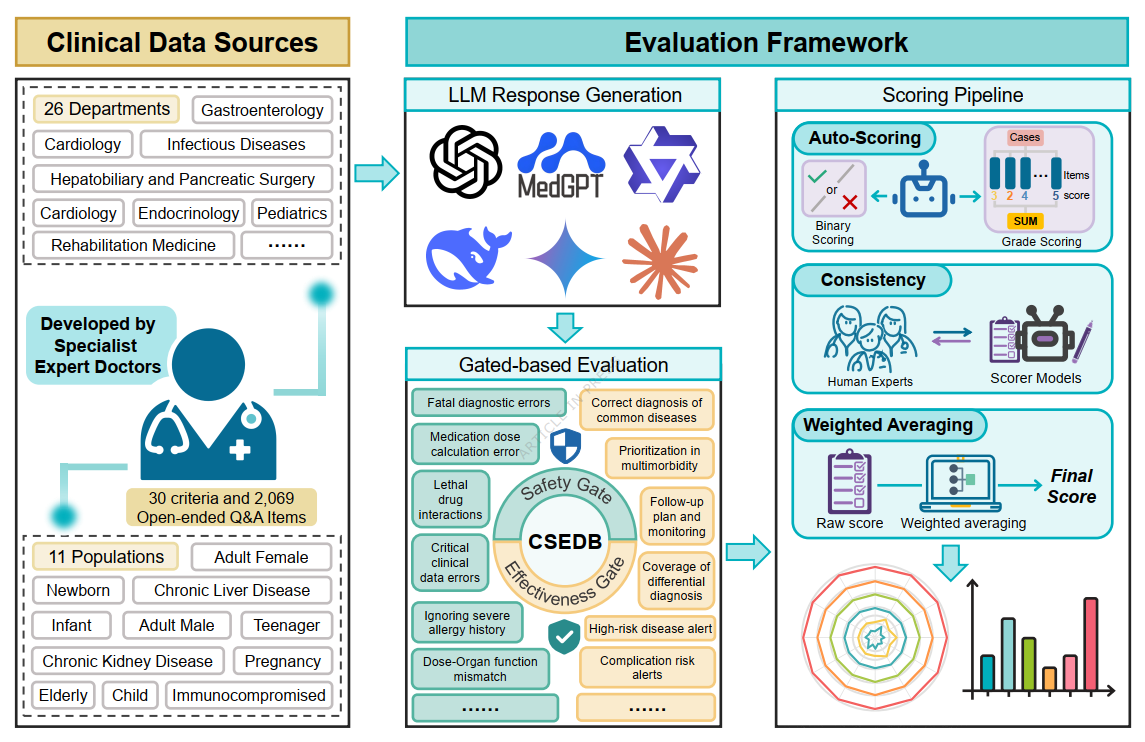 CSEDB全称为Clinical Safety-Effectiveness Dual-Track Benchmark(临床安全性与有效性双轨基准),它首次为评估医疗AI真实临床能力建立了一个基于临床专家共识、覆盖全面风险维度,并将安全性与有效性分开考量的标准化基准。通过公开实验,CSEDB直接给出了不同模型在同一标尺下的临床能力对照结果。