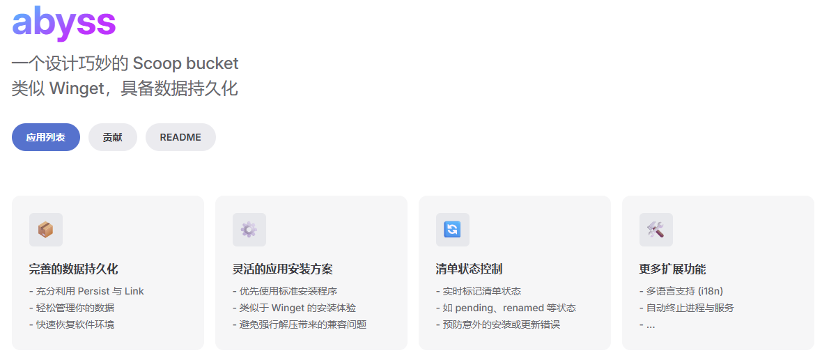 abyss 是一个非常特殊的 Scoop bucket,它旨在成为类似 Winget 的 Scoop 方案 + 数据持久化。区别于标准的 Scoop bucket,它还包含了一些额外的特性。