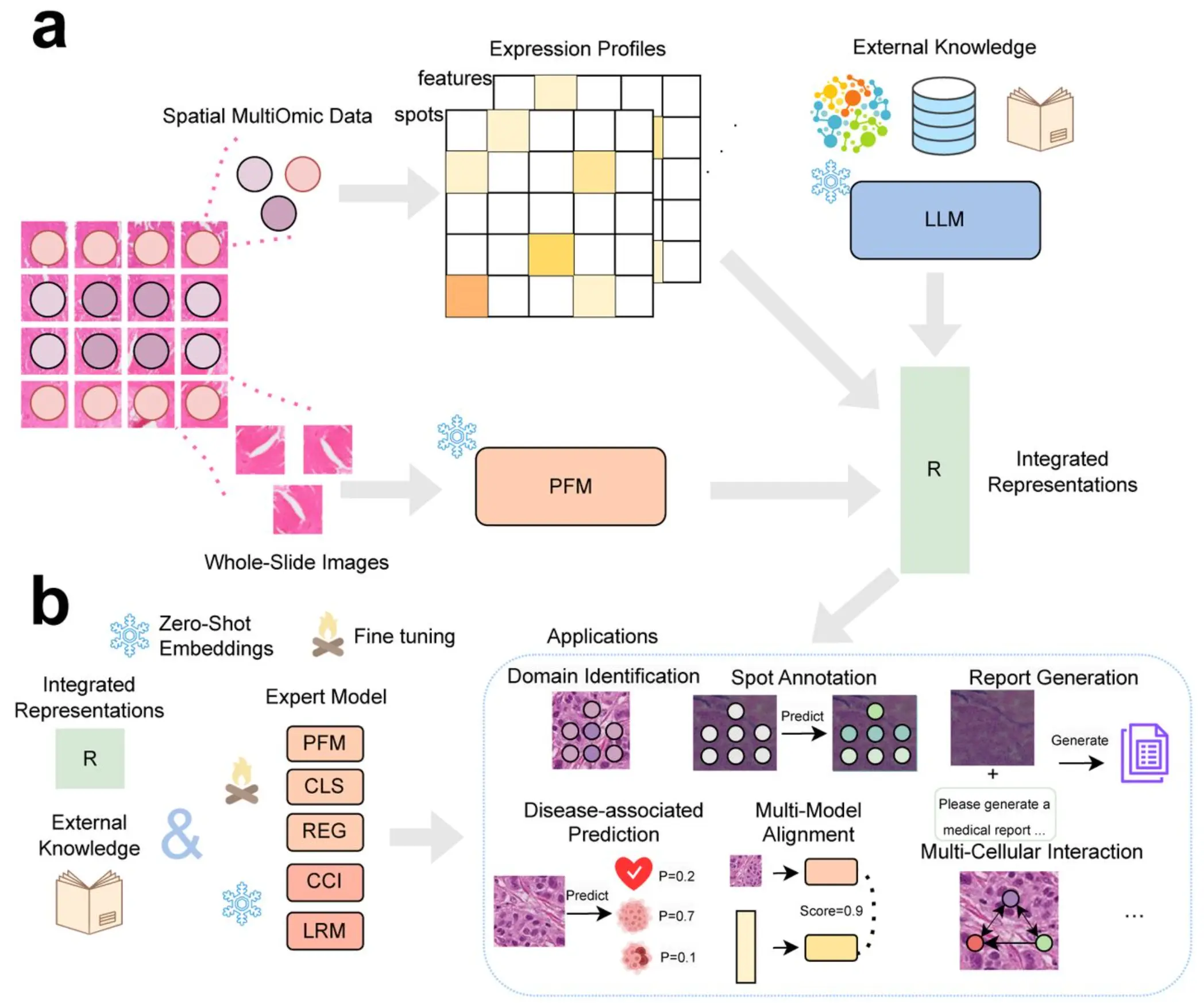 该论文提出一个用于空间多模态数据分析的新型框架spEMO,可将病理学基础模型与大语言模型的嵌入表示统一,用于空间多组学分析。通过整合来自多模态的生物学先验知识(包括 LLMs 与 PFMs,尤其是全切片图像(Whole Slide Images, WSIs)嵌入)实现数据统一。通过将这些嵌入与空间解析的转录组和多组学数据结合,spEMO 构建了一个训练灵活的框架,并通过任务专用专家模块增强下游分析能力。