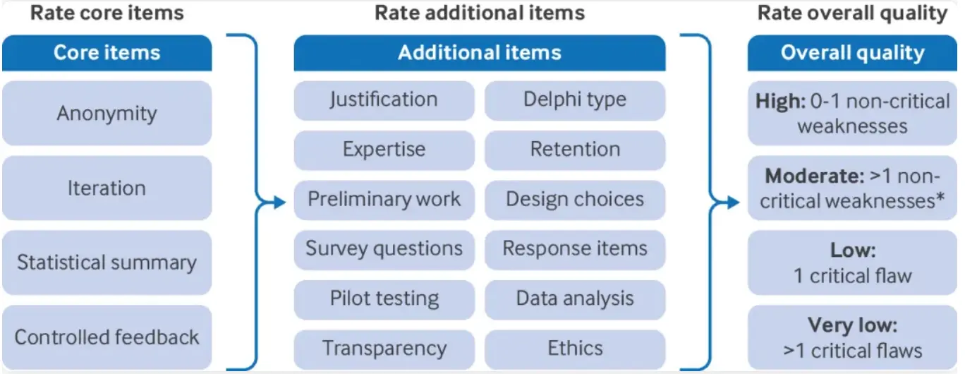 德尔菲法 (Delphi method) 在医学研究中广泛用于临床指南制定、医疗质量指标开发、临床试验终点指标确定。它由4个核心条目和12个附加条目组成,涵盖了从研究设计到结果报告的全过程。DCAT 可帮助审稿人、读者、系统评价团队和研究设计者全面评估德尔菲研究的质量并指导高质量的研究设计。