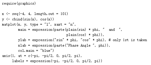 当你在 R 的绘图函数(如 text、mtext、axis、legend 以及标题 main 等)中使用 R 的 expression(表达式) 对象时,R 会按照类似 TeX 的规则将其渲染为排版精美的数学公式。这里介绍了常见的渲染类型。在 R 控制台中输入 demo(plotmath) 可以直接查看所有可用的数学符号及其对应的代码示例。