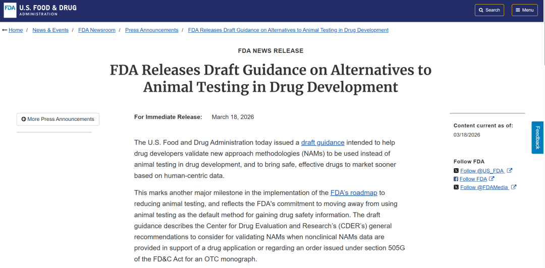 2026年3月18日,美国FDA发布了一份具有里程碑意义的草案指南,正式为替代动物实验的新方法(NAM)打开监管大门。这意味着,类器官、器官芯片、计算机模拟等前沿技术,将有望取代传统动物实验,成为药物研发的主流路径。