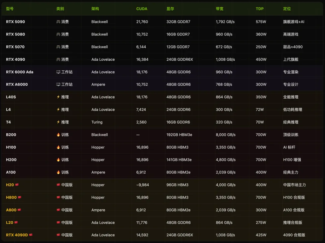 这篇文章是一份英伟达 GPU 全系列的硬核科普手册:从游戏显卡到 AI 超级芯片,覆盖消费级 GeForce(RTX 5090 ~ RTX 3090)、工作站 RTX Pro(RTX 6000 Ada / RTX A6000)、推理卡 L/T 系列(L40S / L4 / T4)、训练卡 B/H/A 系列(B200 / H200 / H100 / A100)以及中国特供版(H20 / L20 / RTX 4090D)五大产品线。