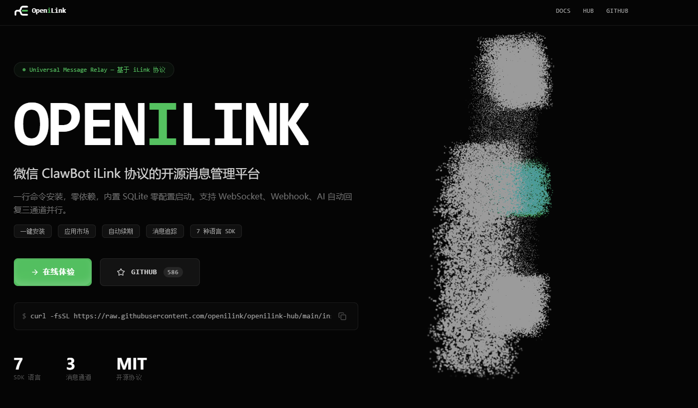 微信 3 月开放了 iLink 协议(ClawBot 插件),第一次官方允许用程序收发个人号消息。OpeniLink Hub 基于这个协议做了一个开源消息管理平台:接入 AI 大模型: 填个 API Key,微信自动调 Claude、ChatGPT、Ollama 等大模型回复,微信号变 AI 助手。一行命令安装,内置 SQLite 零配置,7 种语言 SDK,MIT 开源。